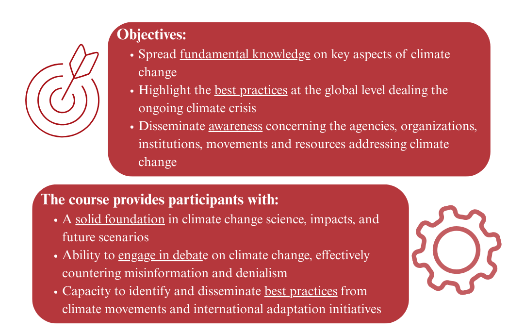 The MOOC is organized into five interconnected modules designed to provide participants with essential knowledge on the key dimensions of climate change, climate justice and just transition. Throughout the course, learners will gain a solid understanding of climate phenomenology, the current state of the global climate system, and the potential future scenarios shaping our planet. Special attention is given to the impacts of extreme weather events and climate extremes, offering insights into how ecosystems and societies are already being affected.