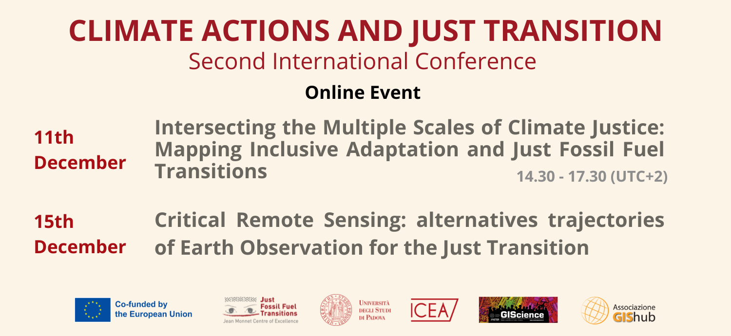 The first online day (11th December | 14.30 -17. 30 (UTC+2)) of the conference is part of the Smart and Sustainable Planning for Cities and Regions Conference organized by EURAC Research within the session “Intersecting the Multiple Scales of Climate Justice: Mapping Inclusive Adaptation and Just Fossil Fuel Transitions“. The aim of the first day is collects study cases, perspectives, challenges, and critical reflections on “just transitions” and “just adaptation,” aiming to stimulate debate and promote the recognition and integration of climate justice into climate policies across different governance scales.